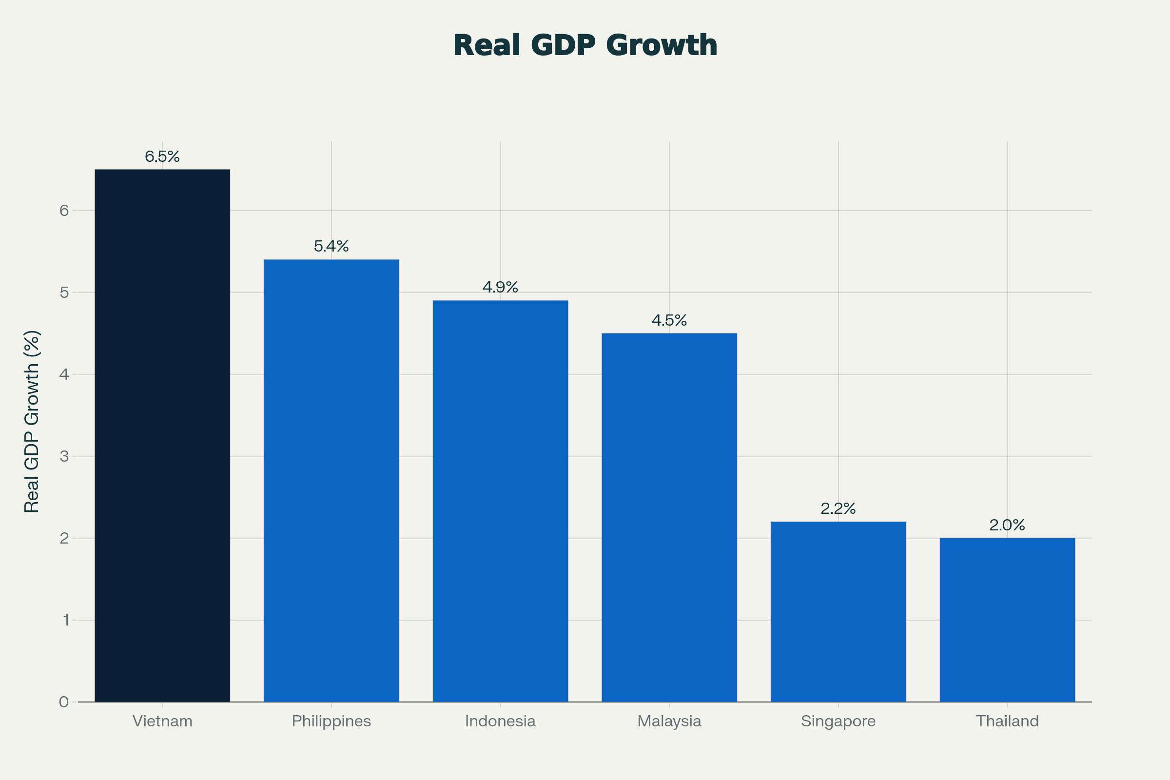 • Vietnam (6.5%): The clear winner for manufacturing and export-oriented businesses. The government is aggressively upgrading infrastructure to support the influx of FDI.